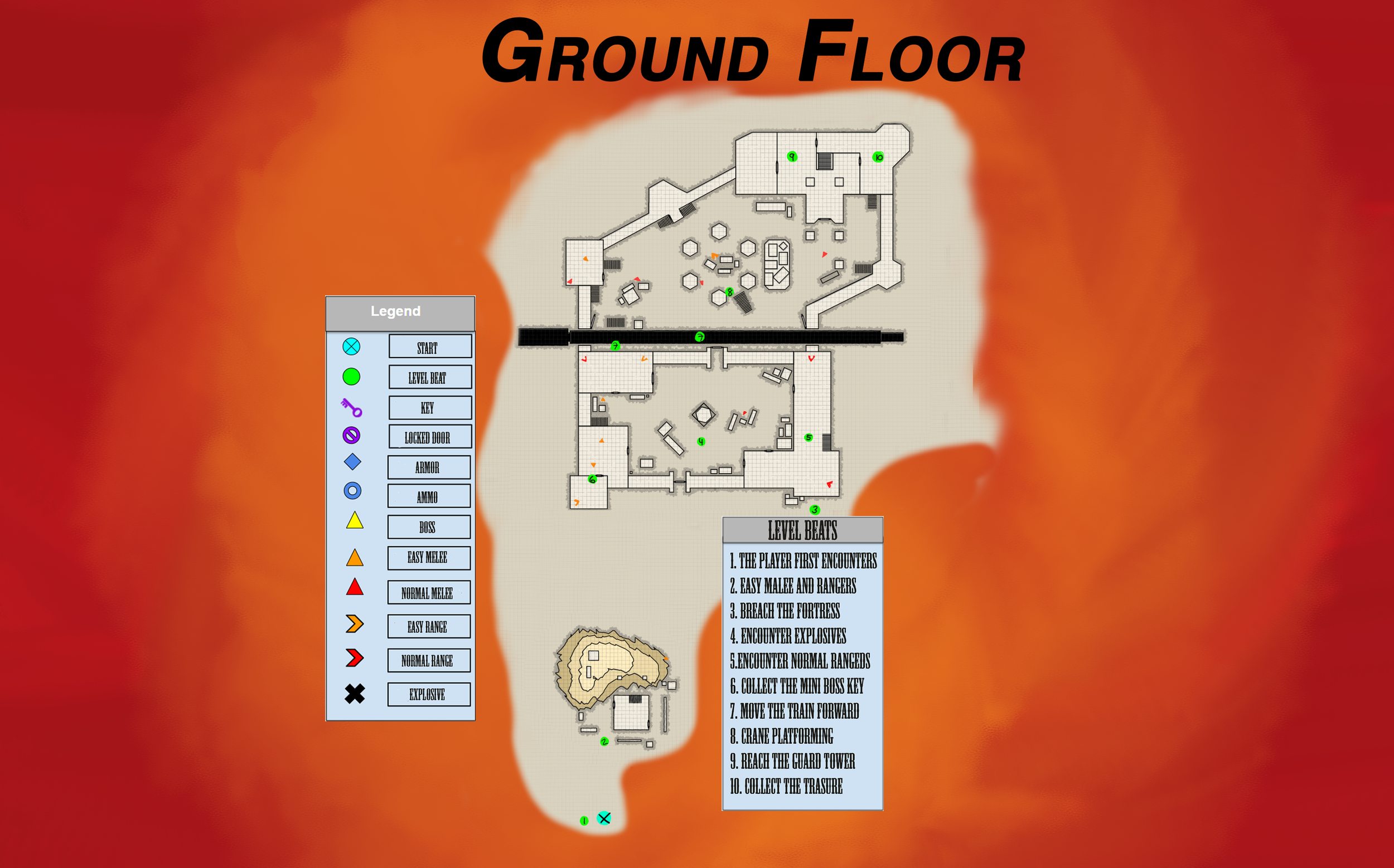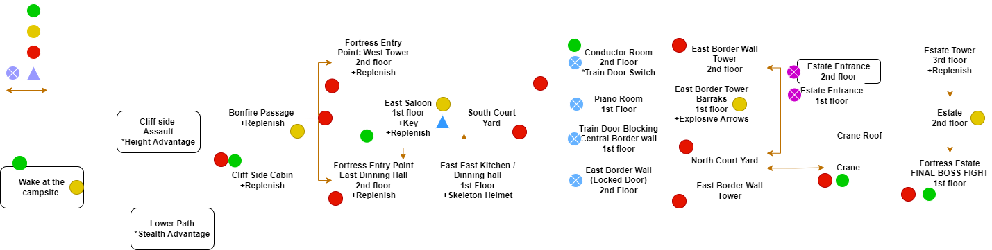 After solidifying my beats and flow map I then developed a guide map to begin establishing a foundation for how I envisioned the spaces and beats to be laid out. I like to imagine the player's perspective and how they’ll view the space and interactions. From their point of view, I can contemplate the environment and combat encounters and challenges to best suit the player experience. I attempt to avoid hand-holding while maintaining fairness.