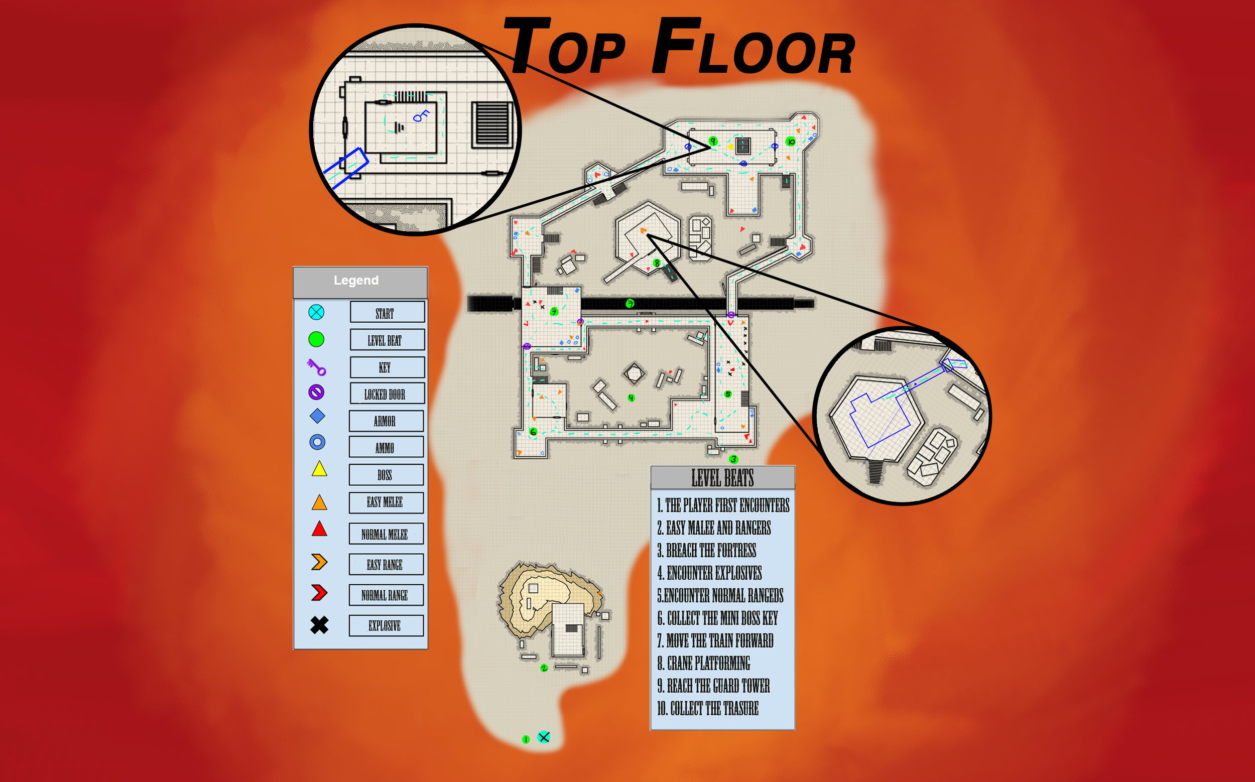 I intended to create a historically accurate representation while including ideas that would suit the narrative, scenarios, and mechanics, such as guards near bomb barrels and scaling the fortress. I focused on creating tactical and strategic level advantages for the player to empower them to experience what it means to be a one-person army.